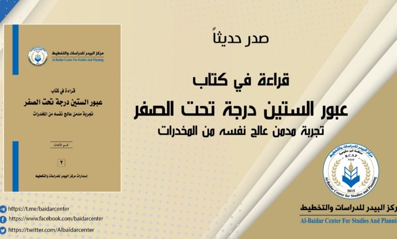 صدر عن مركز البيدر للدراسات والتخطيط كتاب (عبور الستين درجة تحت الصفر – تجربة مدمن عالج نفسه من المخدرات) الذي يسلط الضوء على قضية الإدمان وكيفية علاجه حيث يروي مؤلف الكتاب – الذي كان هو نفسه من المدمنين على المخدّرات – نظرة عامة على هذا الموضوع من خلال الحديث عن تجربته في هذا المجال، ويستعرض بأسلوب مبسّط وسلس المشاكلَ التي يعاني منها المدمن وحدّد أهم العُقَد المستعصية في هذا المجال، وقدّم رأيه من أجل حل هذه العُقَد.